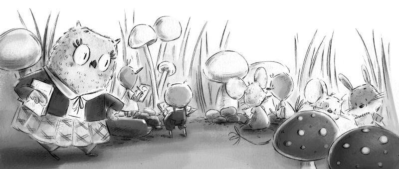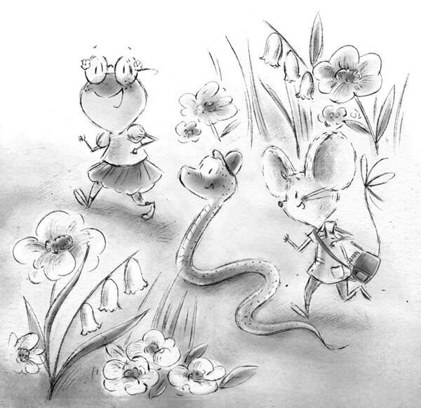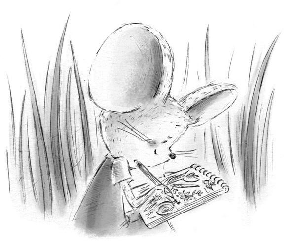 Мышка же с головой ушла в рисование, едва не тыкаясь носиком в альбом. На брёвнышке на переднем плане она нарисовала цепочку бегущих муравьёв.