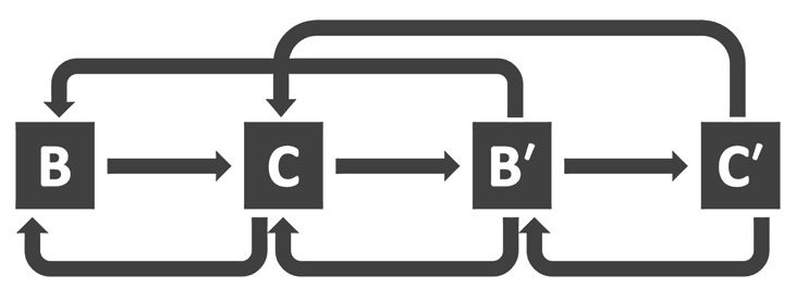 Например, эмоция тревоги (С), вызываемая мыслью «я завалю экзамен» (С), усиливает веру в исходную мысль (С) за счёт так называемой эмоциональной аргументации («если я тревожусь об экзамене, значит вероятность провала выше») и отчасти обусловливает возникновение вторичной мысли «я ни на что не способен» (С). А вторичная мысль «Я ни на что не способен» (С) обострит изначальную тревогу (С) и породит эмоцию подавленности (С) и т. д. Помимо этого, у человека могут возникать как умозаключения о мыслях (вторичные) (С), так и чувства по поводу эмоций (так называемые мета-эмоции) (С). В последнем случае человек может, например, переживать из-за тревоги и испытывать вину по поводу гнева, что нередко ведёт к более серьёзным проблемам, чем изначальные негативные эмоции (см. рис. 5).
