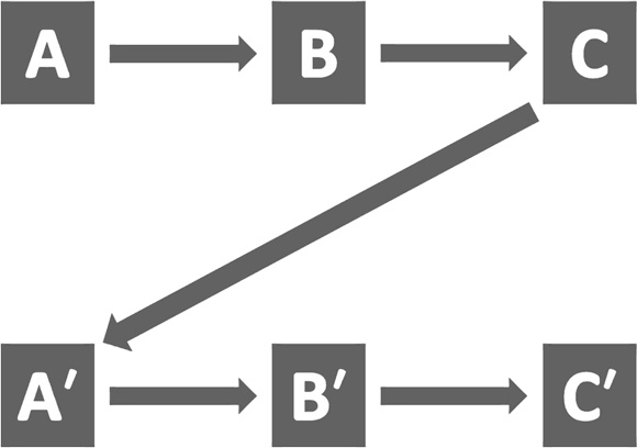 Или, скажем, повышение голоса на родную сестру (С=А´), выступающее поведенческим следствием гнева, может осмысливаться человеком как недопустимое и аморальное (С=А´), что вызовет чувство вины, которое повлечёт за собой извинения перед сестрой (С=А´) (см. рис. 4).