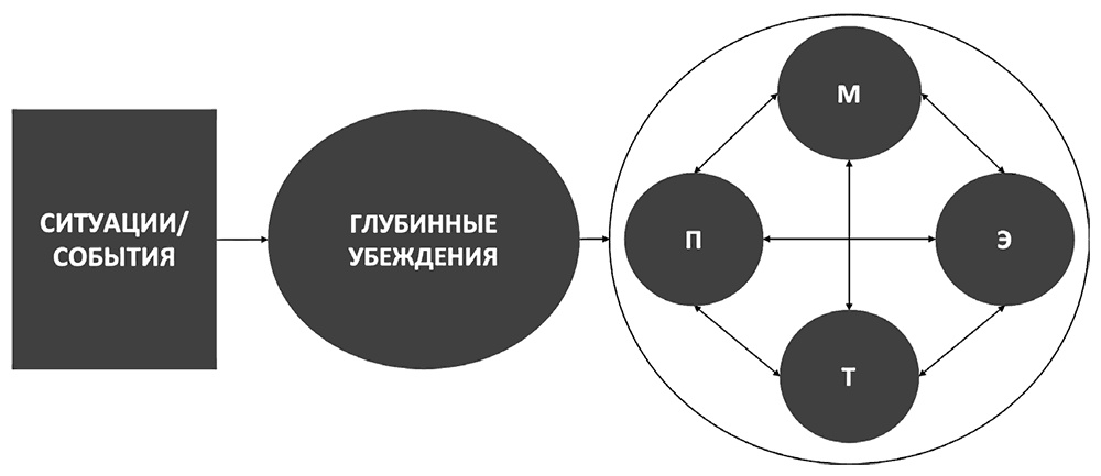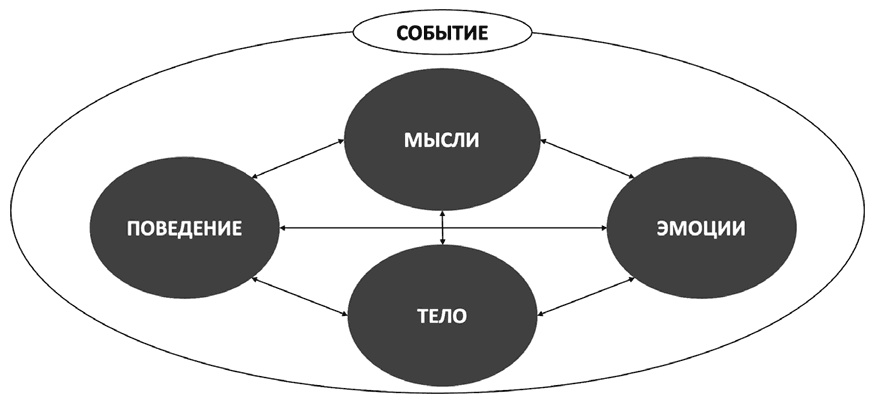 Таким образом, мысли, эмоции, телесные реакции и поведение тесно связаны между собой и образуют единую систему, поэтому изменения в одной из вышерассмотренных сфер могут существенным образом повлиять на изменения и в остальных.
