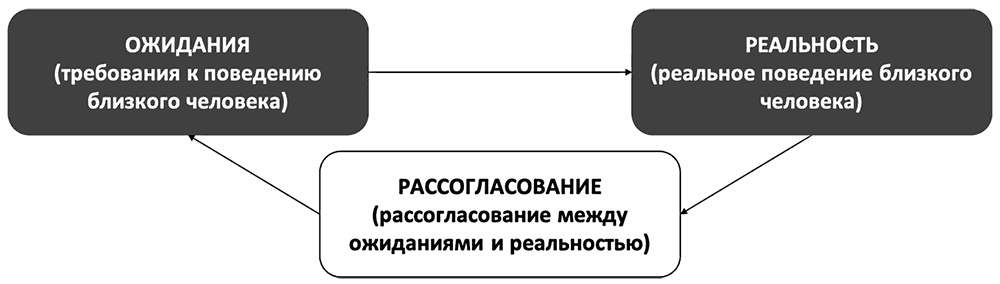 В обиде, как и в гневе, можно выделить три главных компонента: ваши ожидания и требования относительно поведения близкого человека, реальное его поведение и рассогласование между вашими надеждами и действительностью («муж должен был подарить мне цветы», «мой сын не должен был меня обманывать» и т. д. см. рис. 14).