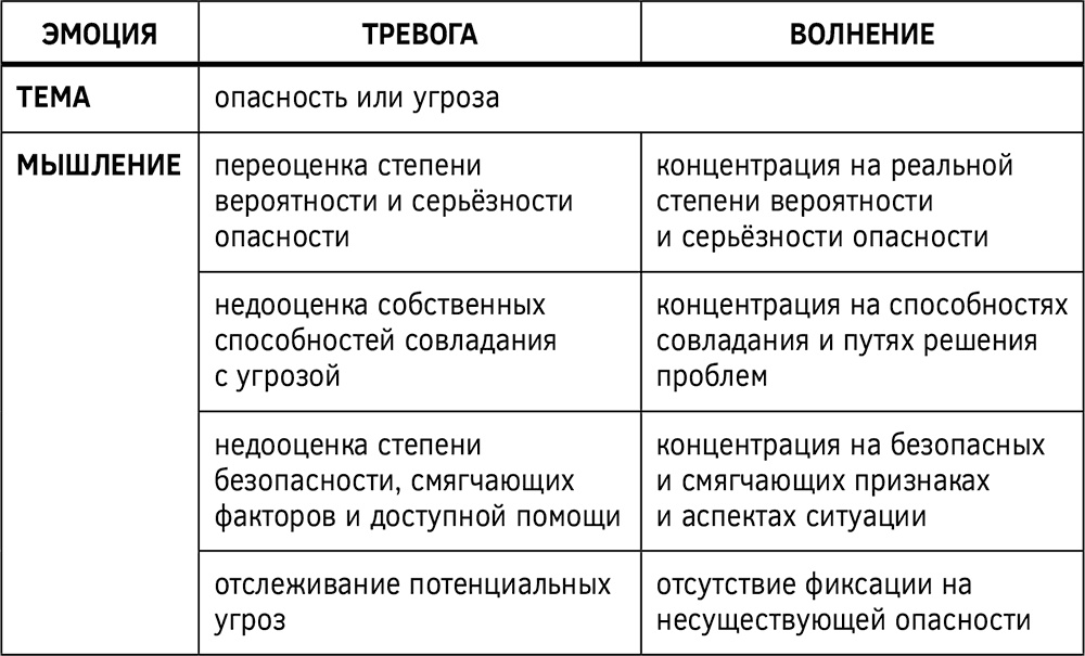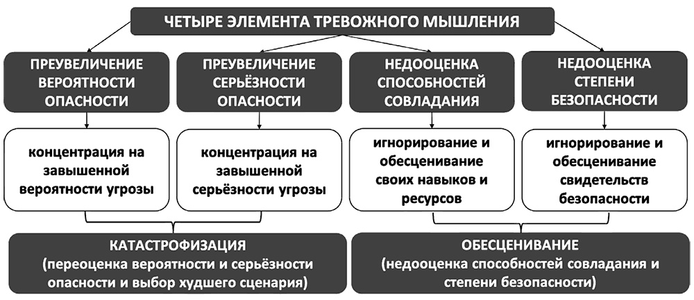 Итак, в самом тревожном мышлении можно выделить четыре главных элемента, которые и обусловливают возникновение тревоги преувеличение вероятности опасности, утрирование серьёзности опасности, недооценка способностей совладания и преуменьшение степени безопасности. В схематичном формате элементы тревожного мышления наглядно представлены ниже (см. рис. 12).