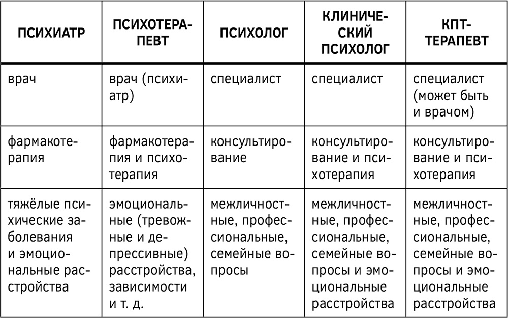 Таблица 1. Отличия специалистов в сфере психологического здоровья