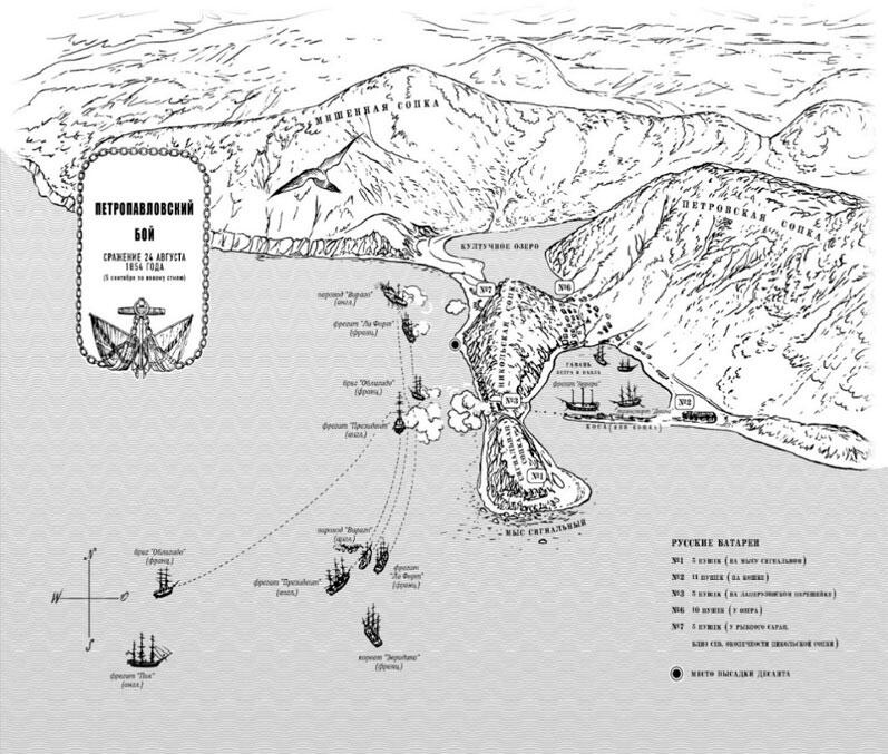 Вскоре замолкает и седьмая батарея, и к половине девятого две первые колонны союзного десанта (это 120 английских морских пехотинцев) высаживаются на берег[343]. Они быстро выстраиваются в боевой порядок, и через пятнадцать минут вершина горы (она называется Никольской) оказывается захваченной. За ними следуют французы, но командир их отряда никак не может найти тропу, по которой можно было бы втащить вверх артиллерию, и в конце концов оставляет её внизу на пляже. Между тем другие десантные отряды расправляются (как, правда, вскоре выяснится, временно) с батареей 6 последней, прикрывающей подступы к Петропавловску. Англичане врываются в город и направляют удар на тылы Смертельной и Перешеечной батарей. Французы, однако, мешкают, никак не могут влезть на вершину и не только не поддерживают британцев, но и, опасаясь разрыва в рядах атакующих, пытаются их вернуть[344]. А тут ещё, теперь уже в глубоком тылу союзников, смешанный англо-французский отряд (120 моряков), начавший было наступление по пляжу в обход Никольской горы, попадает под интенсивный шрапнельный[345] обстрел и останавливается. Ведёт его одна (!) лёгкая (!!) пушка, которую русские успевают увезти с шестой батареи, да так, что вскоре все офицеры отряда, постоянно пытавшиеся поднять своих залёгших подчинённых в атаку, расстаются с жизнью[346].