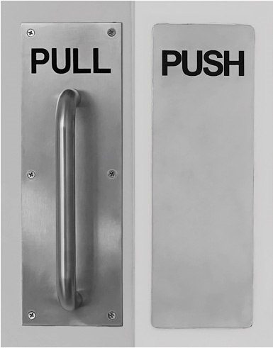 Неудачно сделанные двери повсюду, стоит только присмотреться. Во многих современных офисах стоят стеклянные двери с металлическими ручками, но по их виду непонятно, в какую сторону они открываются. Хороший дизайн защищает от ошибок, потому что подстраивается под мышление человека. Посмотрите, как форма подсказывает, что нужно делать, даже если не читать надпись: