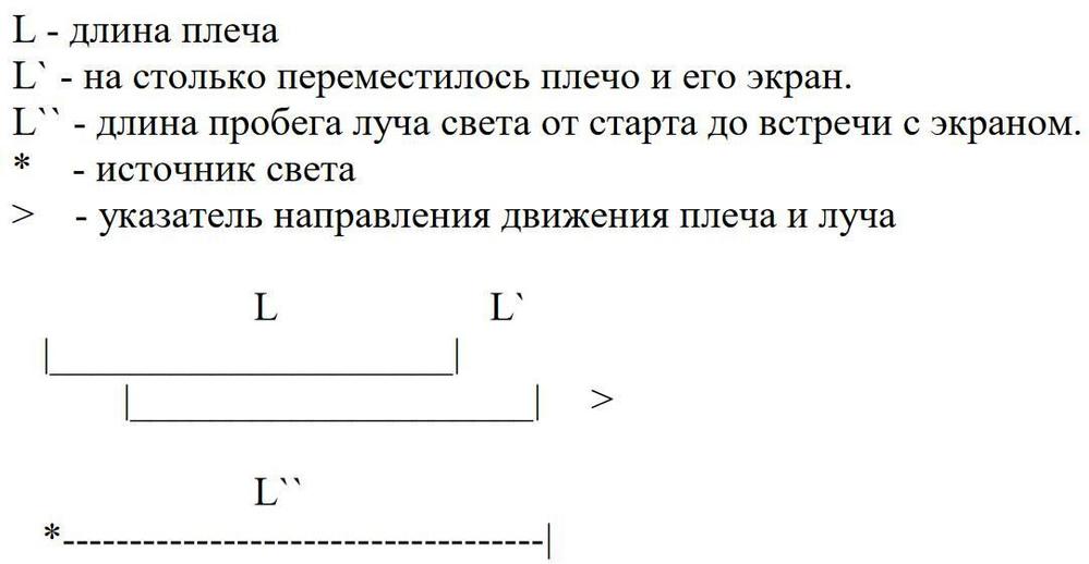 а) Луч Света ( * ) идет от начала плеча и до конца его. Но при этом и само плечо движется в сторону движения луча. Поэтому длина пробега луча увеличивается