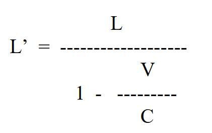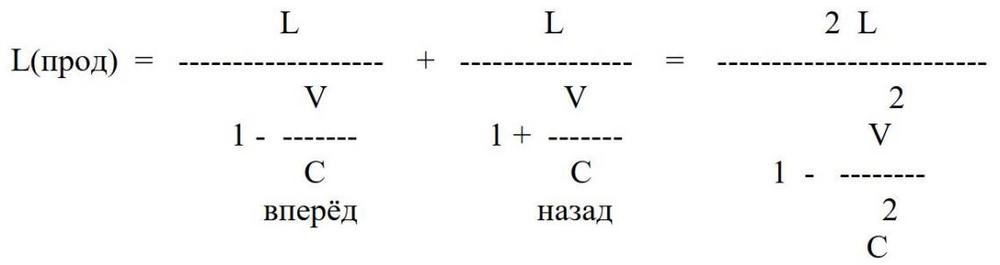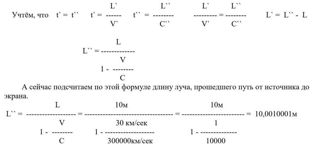 Лучу света ( * ) надо дойти до крайней преграды экрана. Но при этом, и экран тоже движется "убегает" ( L` ). Но луч, двигаясь быстрее, нагонит его, пройдя, за одно и тоже время, большее расстояние ( L`` ). Выведем эту известную формулу.