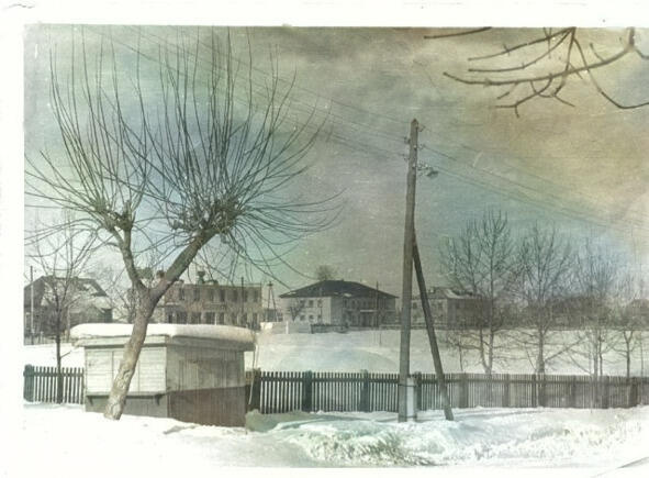 «1967 г. Стадион Слева за стадионом деревянное здание это музыкальная школа, открытая в 1960 г., правее аптека, правее гостиница». Источник: https://vk.com/album-96380845_232095192