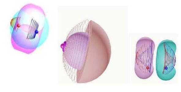 Фотоатомныереакции. Свойства различных микровихронов образовывать те или иные микрочастицы, прежде всего, зависят от промежутка времени и скорости изменения полей, породивших их, а уж потом от условий полей пространства, через которые они проходят. Внешние свойства вихронов также зависят от длины волны, как свойства радиоволн отличаются от свойств световых фотонов, рентгеновских лучей и гамма-квантов. Основной процесс приводящий к взаимодействию свободных электромагнитных микровихронов с веществом или полем заключается в торможении их магнитного заряда при разрядке путём захвата собственного электромонополя внешним электрическим полем ядра, атома или электрона или другого электрического поля пространства, с образованием промежуточного состояния, при котором магнитный заряд совершает высокочастотный квантовый переход в гравитационный монополь. В результате часть или вся энергия магнитного заряда распределяется между электро или гравпотенциалами соответствующих волноводов. Так, например, при энергии налетающего на атом фотона гамма-излучения выше пороговой в 1022 Кэв электромонополь его свободного микровихрона тормозит до полной остановки движение магнитного монополя, взаимодействуя с полем атомного ядра. При этом происходит его деление на два самостоятельных, но замкнутых и покоящихся вихронов, в фазовом объёме которых уже рождаются гравитационныемонополи носители индуктированной энергии в состоянии относительного покоя. На фото 4 приведена схема делениясвободного вихрона таких фотонов на два разнополярных (красный и синий).