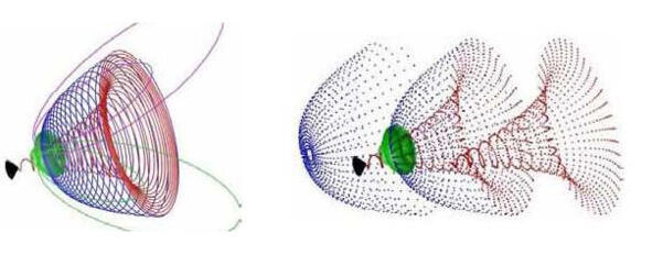 Фото 4а. Излучение гравитационного (красный) и электрического (синий) внешних полей электрона