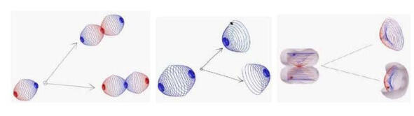 Непрерывное изменение параметров вещественной материи этих частиц происходит через соответствующие законы сохранения (сохранение средней энергии) при самоиндукции зарядов энергии из формы покоя (гравитационный) в форму замкнутого движения (магнитный) с построением волновода геометрической структуры (электрический). При этом имеется две возможности построения волноводов геометрической структуры частиц. Первая разряд магнитного монополя с перезарядкой знака через посредство электрического монополя и последующим квантовым переходом в гравитационный монополь, который опять при разрядке регенерирует первичный магнитный, т.е. образуется замкнутый волновод π-ноль мезона, как основа внутренних ядерных оболочек. Вторая образование волновода заряженных мезонов из двух одинаковых по знаку магнитных монополей, объединённых в пары с противоположно направленными спинами по аналогии куперовских пар электронов, как основа внешних оболочек ядер. Этот процесс аналогичен для всех замкнутых вихронов и определяется только параметрами магнитного монополя частота колебаний, значение заряда, степень поляризации, время зарядки.