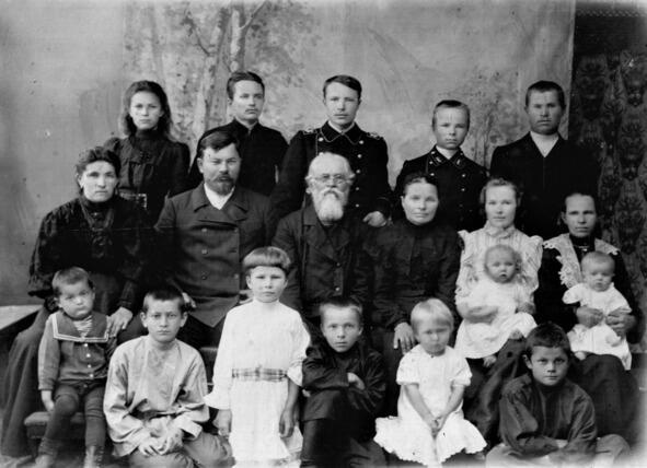 Семья Василия Филипповича Колесникова (в центре). В заднем ряду Александр Владимирович и Иван Владимирович Тюрины (третий и четвертый слева). Мензелинск, 1909 год