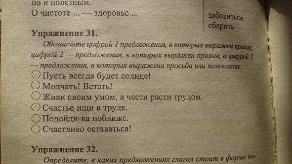 В частности, в приведённом упражнении по мнению составителей теста в предложении «Молчать! Встать!» выражен приказ. А в предложениях «Подойди-ка поближе» и «Счастливо оставаться!» просьба или пожелание. Здесь, скорее, нужно иметь в виду, что если вы пишете художественное произведение, то для передачи вида побуждения нужно учитывать сложившиеся правила их передачи в тексте. Но главное, по моему мнению, это всё-таки контекст. В качестве примера можно привести самое известное побуждающее к путешествию предложение из трёх слов, одно из которых матерное из трёх букв.