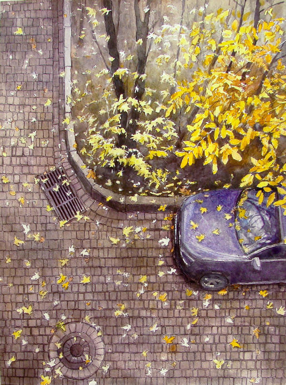 2018/картина Елены Юшиной «Под окном припарковалась осень», акварель, тушь/