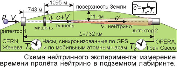У ученых из группы OPERA в в итальянском Гран Сассо, в отличие от автора статьи, есть возможность проводить прямые измерения скорости микрочастиц. Нейтрино то ли не имеет массу покоя, словно квант света, то ли все-таки имеет. Подобно фотону, оно мчится со скоростью С. Скорость самого источника значения не имеет. По крайней мере, так принято считать. Пользуясь синхронизированными детекторами, итальянские физики обнаруживают существование «маленьких нейтронов», движущихся со скоростью, превышающей С на 7,5 км. с. Возможная погрешность ниже такого отклонения на три порядка. Публикация состоится в 2011 г., и сразу вызывает шквал критики. Экспериментаторам приходится неловко оправдываться.