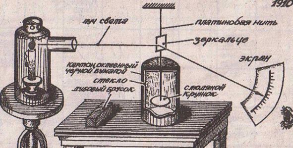 Обратимся к статье В. Беляева, опубликованной в «ТМ» 9, далекого 1980 г. Автор воспроизводит опыты профессора Н. Мышкина (а также Вильяма Крукса), произведенные в начале двадцатого века. Оказывается, диск, подвешенный на тонкой нити, без видимых причин, периодически поворачивается на тот или иной угол. Эти движения коррелируют с солнечной активностью, положением Луны, даже тогда, когда весы находятся в подвальном помещении. В первом приближении, крутильные весы и есть датчик скрытой компоненты светового луча. В отличие от полупрозрачного лепестка, измеряющего давление в опытах академика П. Лебедева, наш регистратор света достаточно массивный экран.