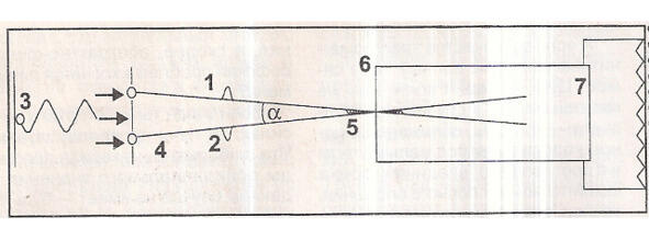 Установка для обнаружения скрытого света. 1,2 противофазные лучи 3. источник когерентных лучей (лазер) 4. устройство сдвига фаз (дифракционная решетка) 5. начало «черной зоны» 6. экран (фольга) 7. светочувствительный материал («Коника», 400 ед.).