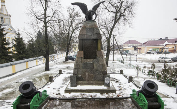 «Возле Свято-Александро-Невского собора стоит памятник русским воинам, одержавшим первую победу над войсками Наполеона в пределах России 15 июля 1812 года. Открыли его в 1913 году, а построили на средства, собранные солдатами и офицерами частей 38-й пехотной дивизии и 38-й артиллерийской бригады, которые дислоцировались в окрестностях города, а также на пожертвования жителей Гродненщины и полков, участвовавших в боях. В Первую мировую город заняли войска кайзеровской Германии. Немцы сняли двуглавого орла, который восседал на гранитном постаменте и мраморные доски. Когда город был польским, на пустующий постамент водрузили бюст Тадеуша Костюшко работы местной скульпторши Бальбины Свитич-Видацкой». Источник: http://news.21.by/society/2016/01/28/1158963.html