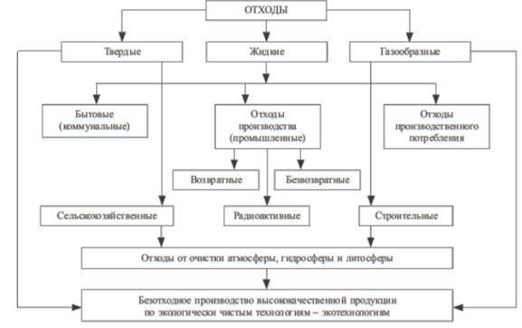 По происхождению существующие отходы классифицируют на промышленные, бытовые (коммунальные) и сельскохозяйственные, рис. 2.1. Отходы производства (промышленные отходы) это разнообразные по составу и физико-химическим свойствам остатки, образующиеся в процессе изготовления продукции и характеризующиеся потребительской ценностью, но использование которых в материальном производстве в виде вторичных материальных ресурсов требует дополнительных технологических операций. Отработанные материалы и вещества классифицируют по агрегатному состоянию.