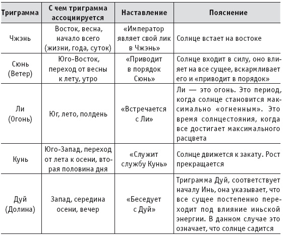 Ранее (см. первый том, глава «Основы китайской философии», раздел «Посленебесный порядок триграмм Вэнь Вана (Хоу-Тянь Ба-Гуа)») уже описывался порядок следования триграмм в посленебесной схеме Ба-Гуа.