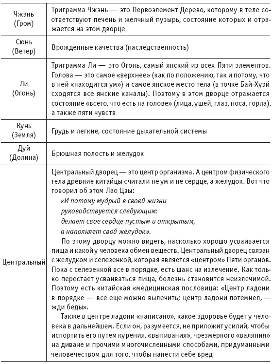 Если сопоставить левый рисунок с рисунками на страницах 96 и 97 первого тома, то можно видеть, что расположение триграмм на ладони в точности соответствует Посленебесной схеме триграмм (только развернутой вокруг вертикальной оси).