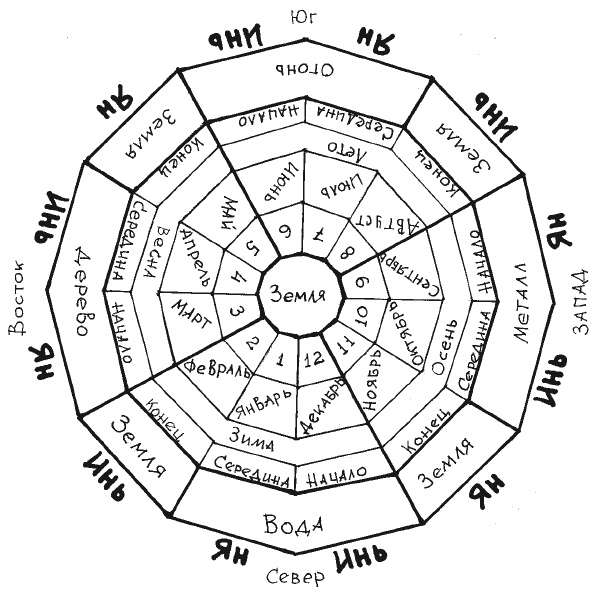«Выбивается из этого распорядка» (вроде бы) только Земля. Но так лишь кажется, ибо она присутствует в конце каждого сезона: в феврале, мае, августе и ноябре. Так происходит потому, что Земля (Почва) это основа всего и находится в центре всего. Именно так и размещен Первоэлемент Земля в схеме «Расположение Пяти элементов крестом» (смотри первый том, главу «Основы китайской философии», раздел «Преобразование Пяти элементов»).