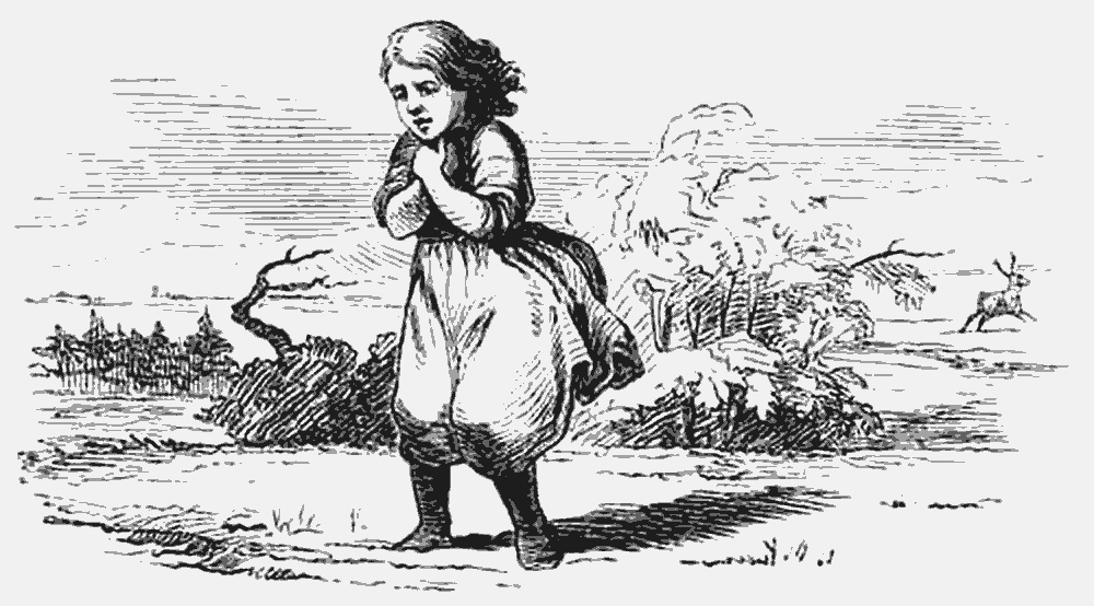 Но олень не смел остановиться, пока не добежал до куста с красными ягодами; тут он спустил девочку, поцеловал её в самые губы, и по щекам его покатились крупные, блестящие слёзы. Затем он стрелой пустился назад. Бедная девочка осталась одна-одинёшенька, на трескучем морозе, без башмаков, без рукавиц.