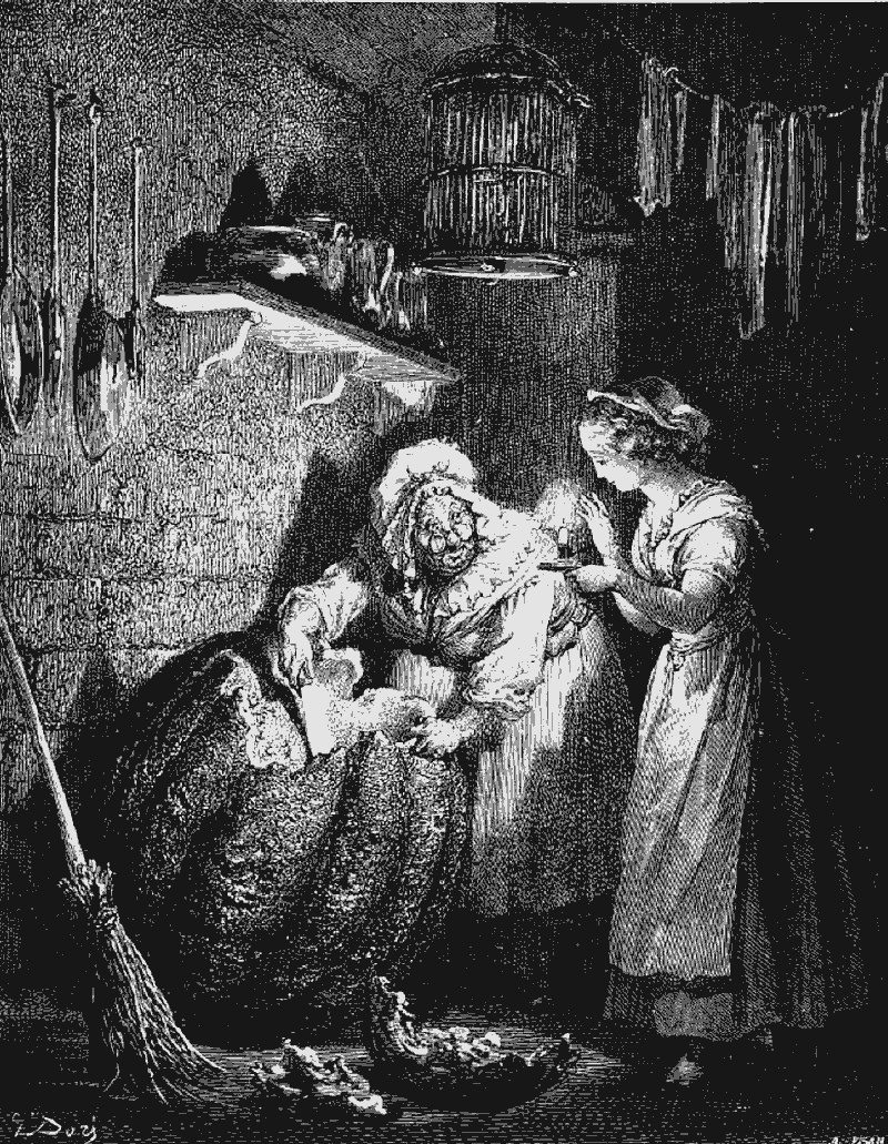 Бедная девушка сносила всё терпеливо и не смела жаловаться отцу, который её же разбранил бы, ибо жена вертела им на все стороны. Окончив работу, она забивалась в уголок камина и садилась прямо на золу, отчего её обыкновенно звали Грязнушкой. А младшая сестра, не такая злая как старшая, называла её Замарашкой. Однако Замарашка, хоть и в чёрном теле, была во сто раз прекраснее своих разодетых сестёр.