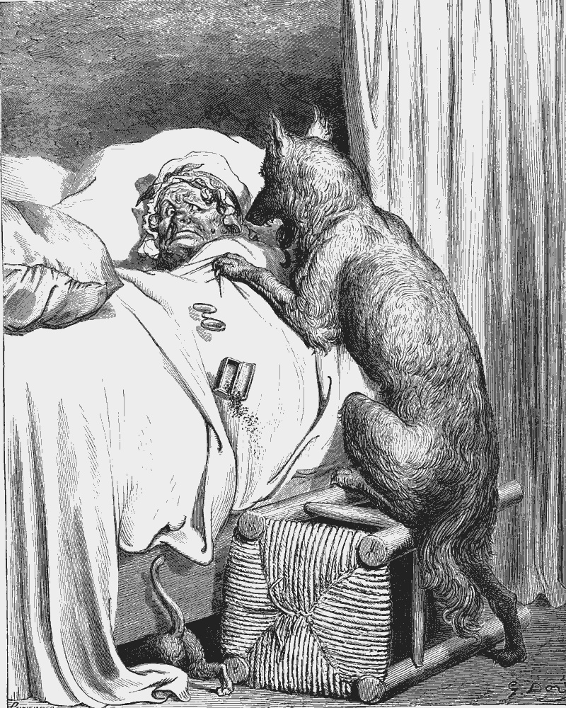 Услышав грубый волчий голос, Красная Шапочка сперва было испугалась, но подумав, что верно у бабушки насморк, отвечала: