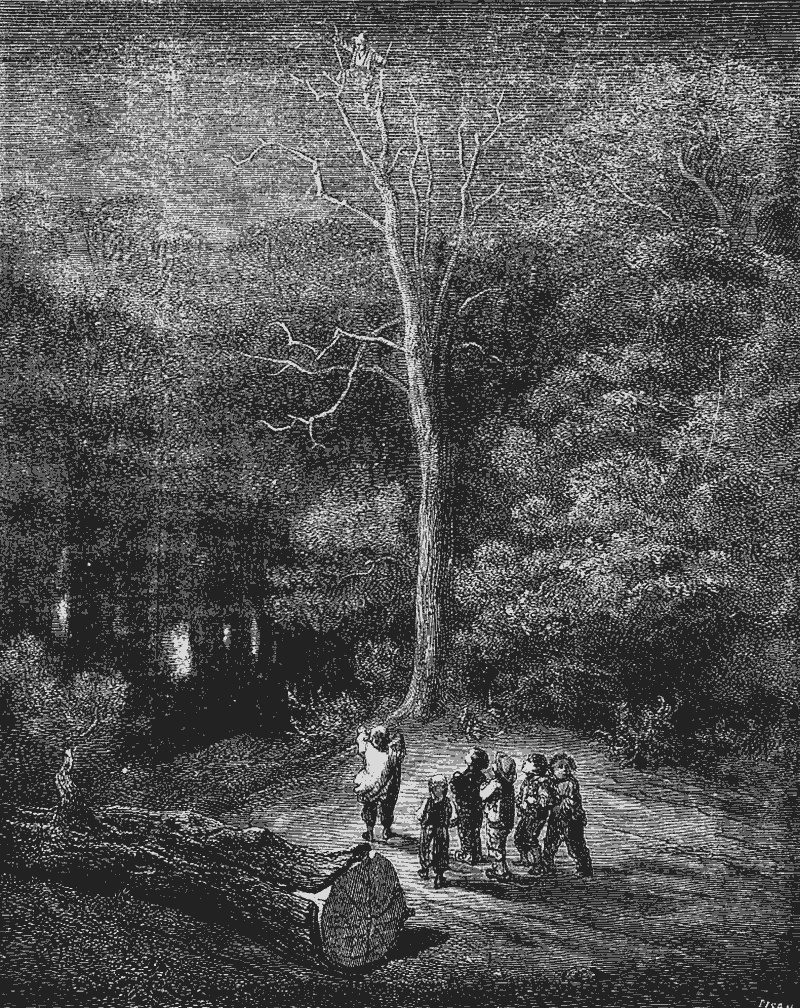 Мальчик-с-Пальчик взлез на дерево, посмотреть нет ли вблизи жилья человеческого. Смотрит он во все стороны, и видит точно свеча светится, но далеко-далеко за лесом. Он слез с дерева. Глядит: с земли ничего не видно; это его огорчило.