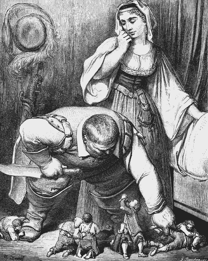 В той же самой комнате стояла другая кровать, такой же величины. На эту-то кровать жена Людоеда положила семерых мальчиков, после чего и сама отправилась спать к своему мужу.