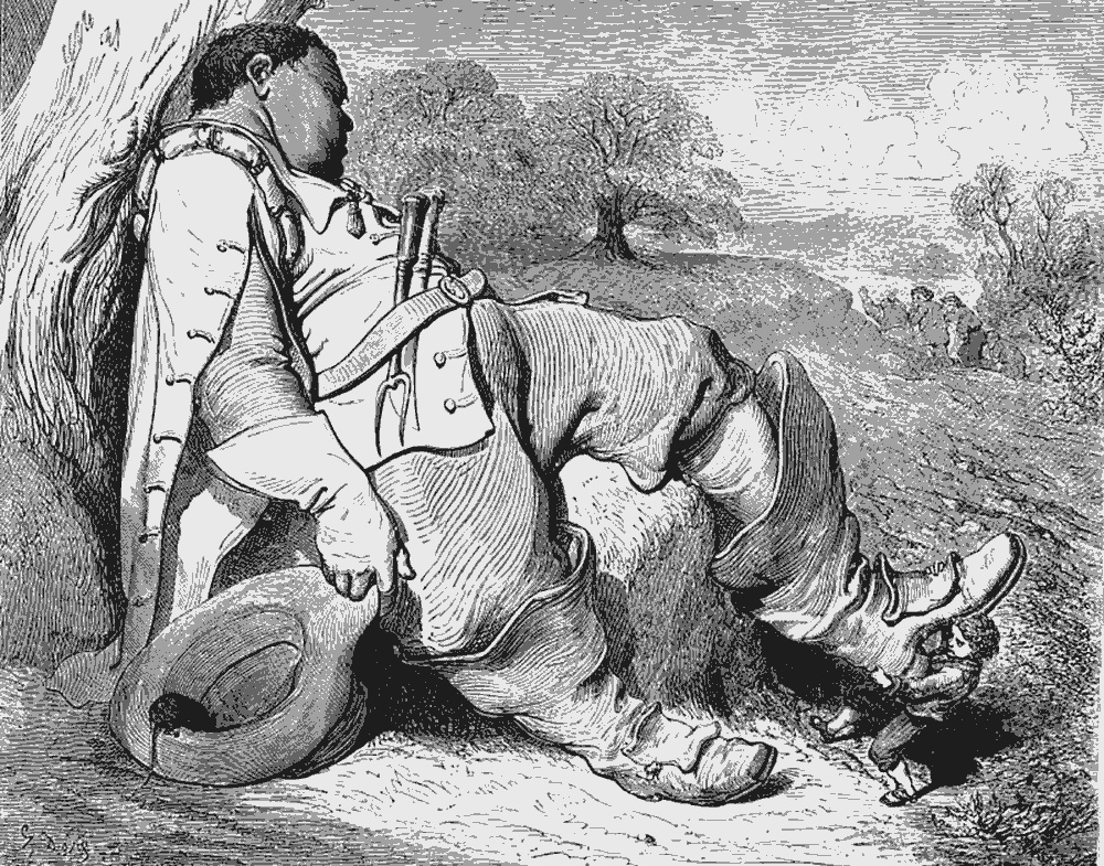 Как он совсем выбился из сил, то через несколько времени заснул и принялся так ужасно храпеть, что бедным детям было менее страшно, когда он грозил им своим большим ножом.