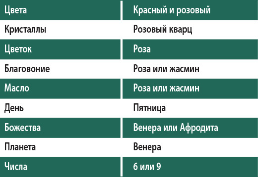 Есть также числовые соответствия для любви шесть и девять. Шесть число любви (и ответственности), а девять число романтики (и творческих талантов). Многие заклинания, описанные в этой главе, включают в себя шесть ингредиентов или используют шесть количественных единиц.