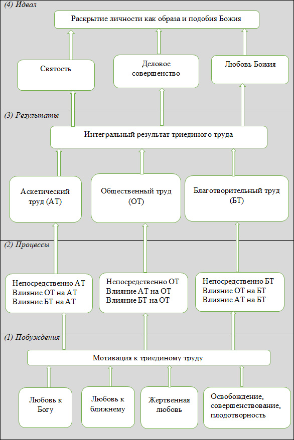 Далее данная классификация проецируется на четыре области: побуждения, процессы, результаты, идеал. Посредством такого проецирования возникает карта системных целей (см. схему 1). Системные цели связаны причинно-следственными отношениями в рамках общей логической последовательности: от побуждений к процессам триединого труда, далее к результатам такого труда и, наконец, к идеалу личности.