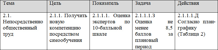 Таблица 1. КД «Приобретение новой компетенции посредством самообучения»Результатом реализации инициативы стало резкое снижение прокрастинации, которое, по оценке Иванова, вполне свидетельствовало о выполнении задачи 2.2.1.1.З. Убедившись в эффективности своего подхода к борьбе с прокрастинацией, Иванов решил делиться опытом со своими друзьями и близкими. Цель 1.3.1. была сформулирована так: «Передавать опыт преодоления прокрастинации тем, кто в нем нуждается». Показатель 1.3.1.1. «Количество проведенных бесед», задача 1.3.1.1.З «В среднем 1 беседа в неделю в течение квартала». Эти примеры показывают общий подход к достижению целей с помощью КД.