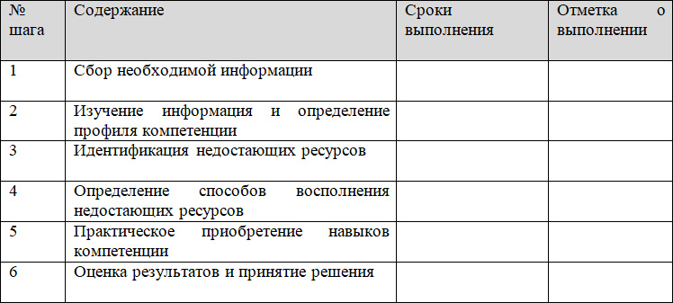 Рассмотрим условный пример. Сотруднику компании Иванову предложили занять более высокую должность. Но она требовала быстрого приобретения дополнительной компетенции, которой у Иванова не было. Тем не менее он принял предложение, разработав комплекс действий для данного случая (см. Таблицы 1 и 2).