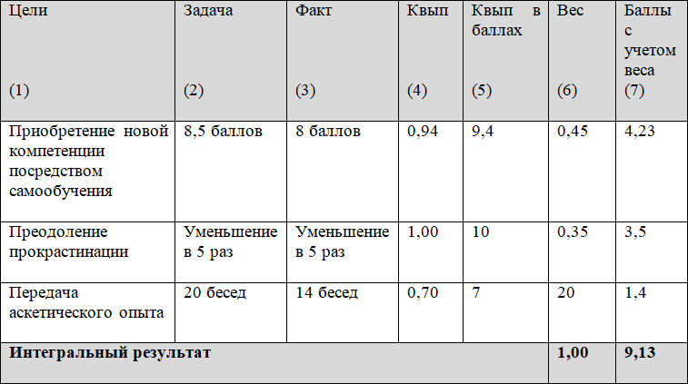 Интегральный результат это общая оценка триединого труда. Она дает представление о том, насколько мы успешны в реализации своей трудовой стратегии. Данный показатель может быть рассчитан по формуле средневзвешенной величины. Для этого частные показатели переводятся в единую (например, 10-балльную) шкалу, и им присваивается вес.