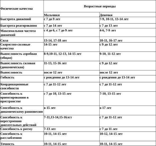 Таблица 11. Сенситивные периоды развития физических качеств (по Филину В. П., Гужаловскому А. А., Волкову В. И., Ляху В. И.)