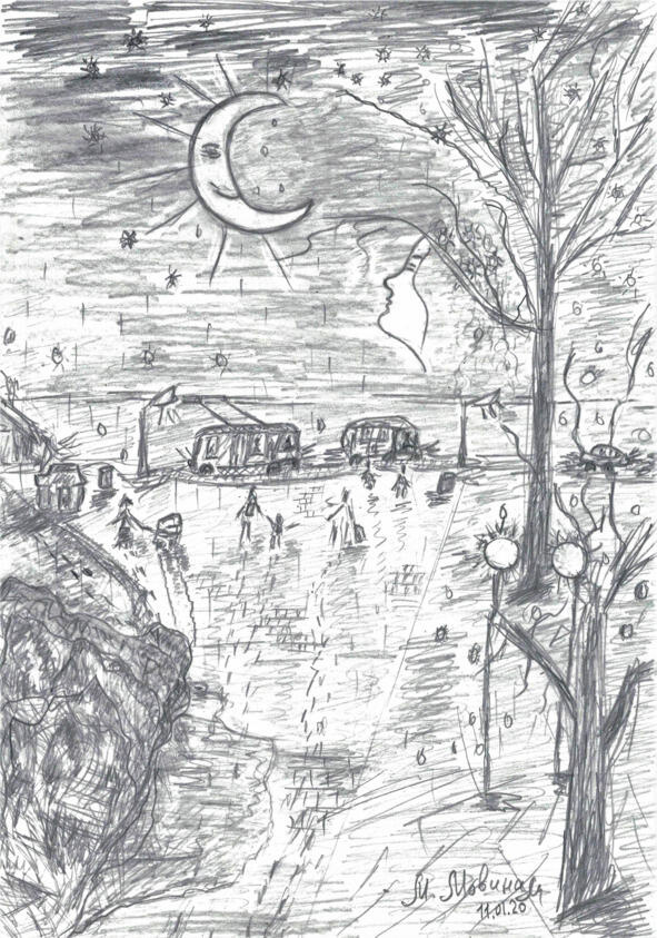 Я уже шла к остановке. По-прежнему воздух был морозный. Молодой месяц игриво наклонился ко мне с небосклона. Ветви деревьев, все в инее, на фоне темного неба, подсвеченные уличными фонарями, создавали сказочное пространство, делая его ажурным и полупрозрачным.