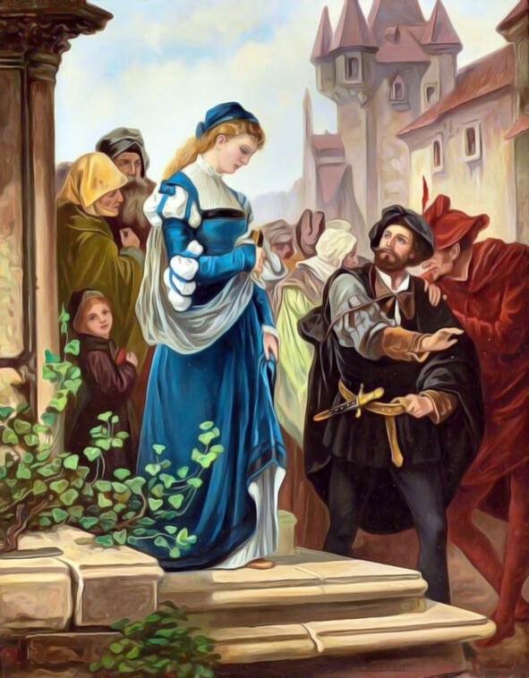 (419 бет.)Эвфорион доғида бағри қон ютган «Еленанинг кийимлари булутга айланиб Фаустни ўрайди ва баландга кўтариб олиб кетади».