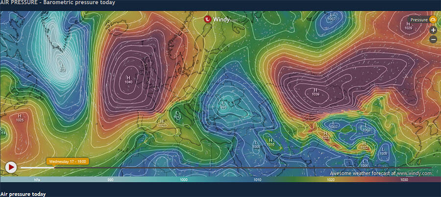 На рис. 3.2.2[2] представлена карта «Текущее измерение атмосферного давления». Она получена, как и предыдущая, на основе расчёта информации с многочисленных датчиков.