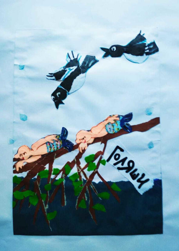 Голяши лежали на ветках среди листвы, подставив солнышку свои спины. Тут и Куд увидел голяшей и очень обрадовался. Но Куделина снова прижала палец к губам и сказала: «Тсс!» Затем взмахнула руками, как крыльями, и Куд повторил за ней.