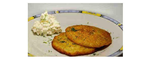 Разложите картофельные оладьи на разогретых тарелках и украсьте ложкой сметаны с хреном.