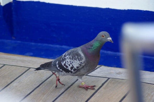 Внезапно на шестую палубу возле бассейна приземляется голубь. Похоже, он здесь живет и увидел в Вовчике конкурента. Долго, неторопливо кружил возле нас, присматриваясь к диковинному пассажиру с длинными ушами. При ближайшем рассмотрении выяснилось, что голубь окольцован на обе ноги.