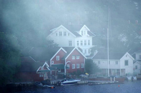 Таинственный туман окутывает домики Арендаля. Но это следствие не природного явления, а просто дым из мощной трубы нашего теплохода.