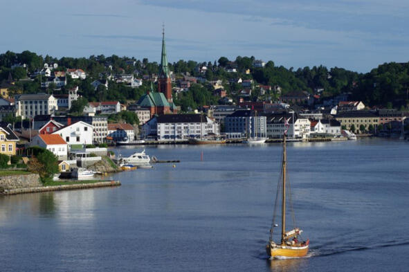 Выходим на берег, садимся в экскурсионные автобусы, пять минут и мы уже в центре Арендала. Небольшой, уютный и чистенький городок встречает российских туристов любопытными взглядами местных жителей. Здесь юг Норвегии, что-то наподобие нашего Сочи. Климат очень мягкий, летом дождей практически нет, а температура воздуха в июле колеблется между 20 и 25 градусами, что очень привлекает норвежцев с северной части страны. Объективы словно по команде нацеливаются на главный собор города.