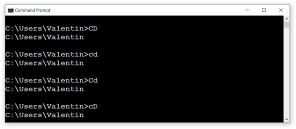 Регистр букв. Команды можно вводить и заглавными (большими) и строчными (маленькими) буквами командной строке Windows это будет понятно: CD, cd, Cd, cD, см. рис.