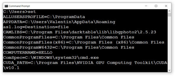 Команда set без параметров выводит текущие значения переменных среды окружения, см. рис.
