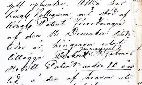 Таким образом Королевская Коммерц-Коллегия предоставила «Иммануилу Яльмару Нобелю» патентное свидетельство с привилегией на десять лет «за изобретение по производству эластических тканей и полотен, <> а также за <> изобретение по производству воздухонепроницаемых тканей и сосудов».