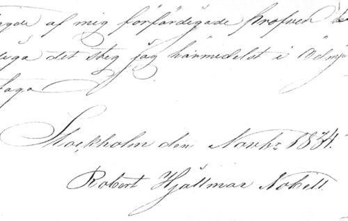 Письмо в Коммерц-Коллегию было подписано И. Я. Нобель и свидетельство об исключительном патентном праве (привилегии), опубликованное в центральном Государственном почтовом вестнике, от 2 мая этого же года, также выставлено на имя Иммануила Яльмара Нобеля. Однако такого лица не существовало имя является комбинацией двух имен Иммануила и второго имени его сына, Роберта (у самого Иммануила второго имени не было). Как возникло это странное имя, видно из архивных документов Коммерц-Коллегии. В рукописном варианте патентного свидетельства автором указан Роберт Яльмар, но первое имя, Роберт, зачеркнуто и заменено на Иммануил.